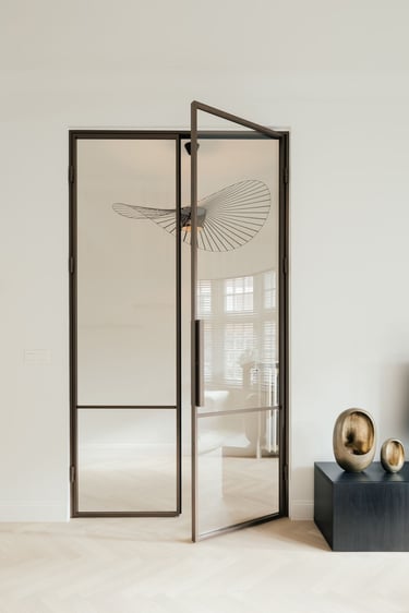 Een pivot deur draait rond een centraal of asymmetrisch geplaatste as, in plaats van traditionele scharnieren. Dit type deur is functioneel en kan zowel kleinere als grotere deuren soepel laten bewegen, afhankelijk van de beschikbare ruimte.